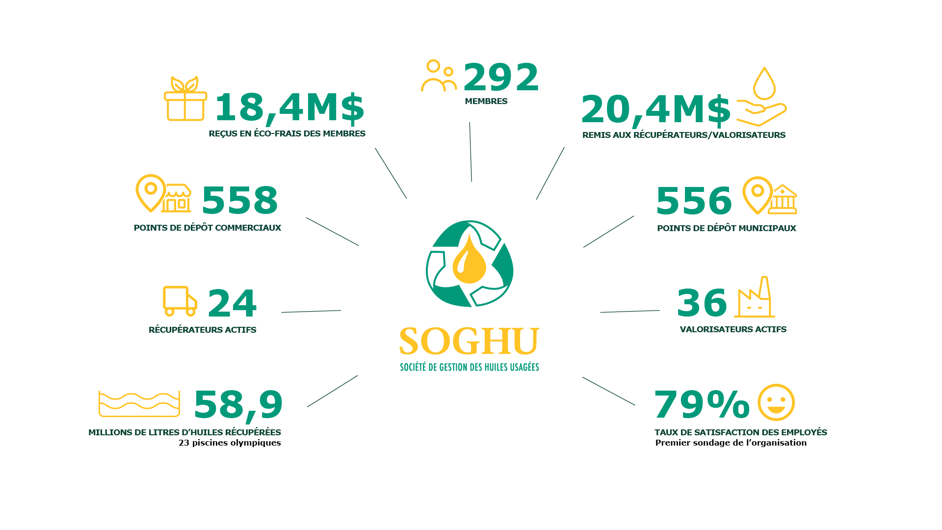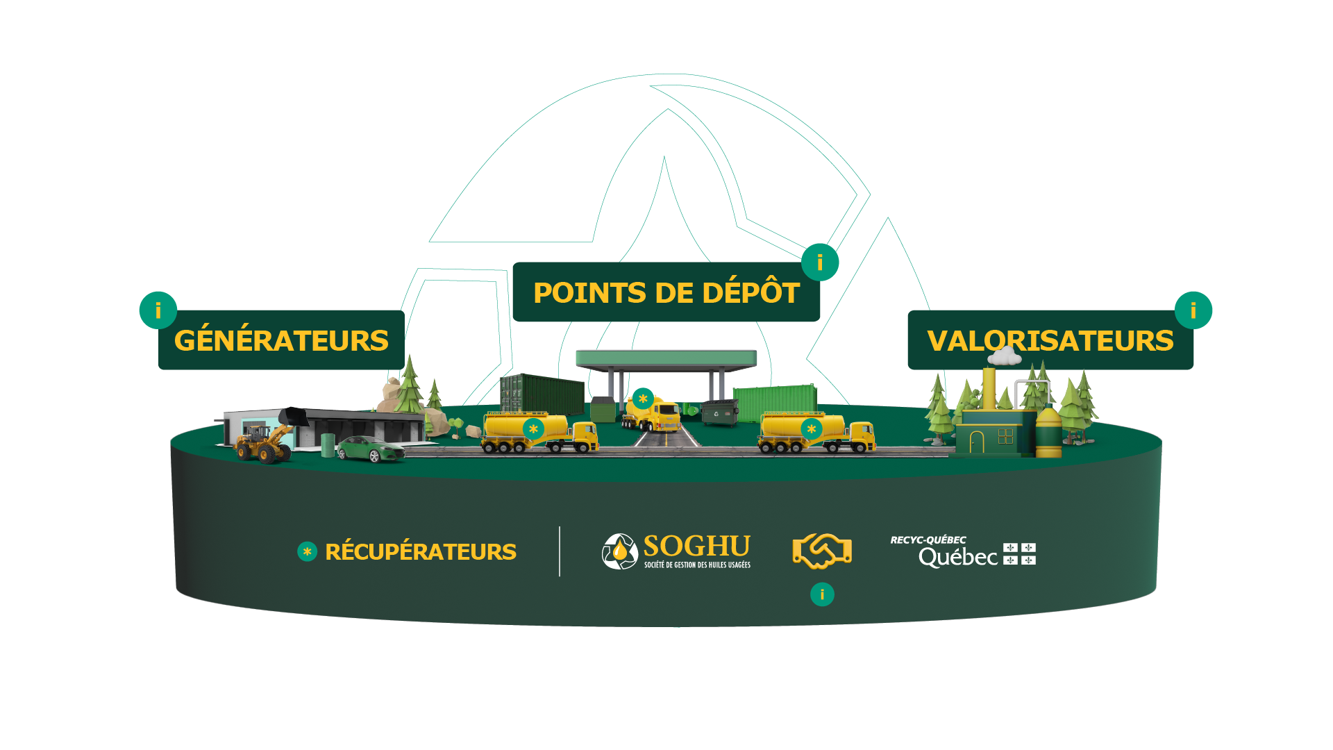 Sur l'ensemble du territoire québécois, nous pouvons compter sur notre solide réseau de points de dépôt enregistrés SOGHU. Ils occupent un rôle essentiel auprès de la population et des petits générateurs en acceptant leurs produits usagés d'entretien mécanique dans leur établissement. Il s'agit là d'un geste environnemental concret que d'offrir gratuitement ce service aux citoyens, une preuve de leur volonté de contribuer à un Québec plus propre et durable. Nous les remercions de leur précieuse collaboration, et ce, aux quatre coins de la province.