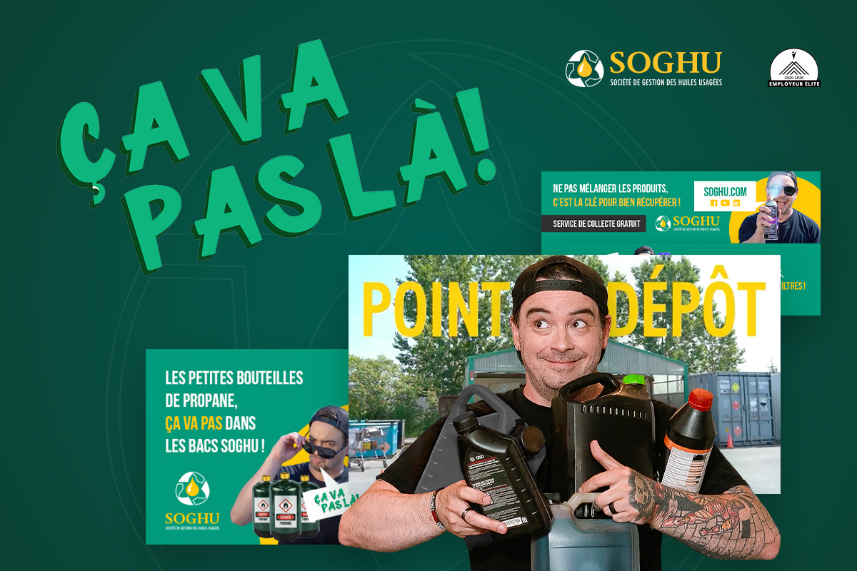 En 2024, la campagne publicitaire « Ça va pas là » a poursuivi son déploiement par le biais de 3 capsules dans le but de sensibiliser le grand public et les usagers de produits d'entretien mécanique à l'importance de disposer adéquatement de leurs produits usagés et de les rapporter dans un point de dépôt SOGHU.