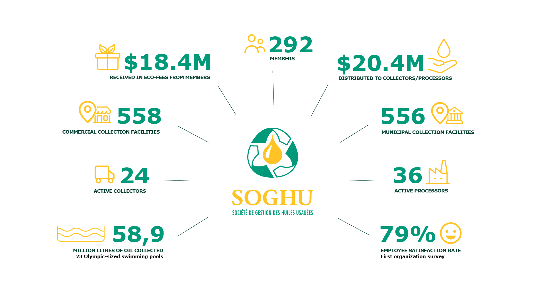 Across Quebec, we can count on our strong network of registered SOGHU Collection Facilities. They play a vital role in serving the public and small generators by accepting used mechanical maintenance products at their locations. Offering this service free of charge to residents is a concrete environmental gesture, demonstrating their commitment to contributing to a cleaner and more sustainable Quebec. We want to thank them for their valuable collaboration across the province.